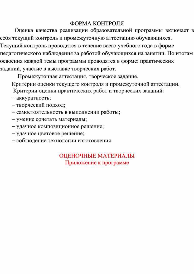 Текущий контроль: педагогическое наблюдение, практическое задание, выставка творческих работ |