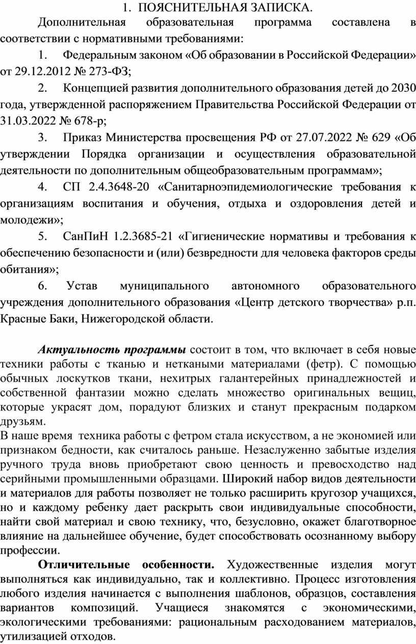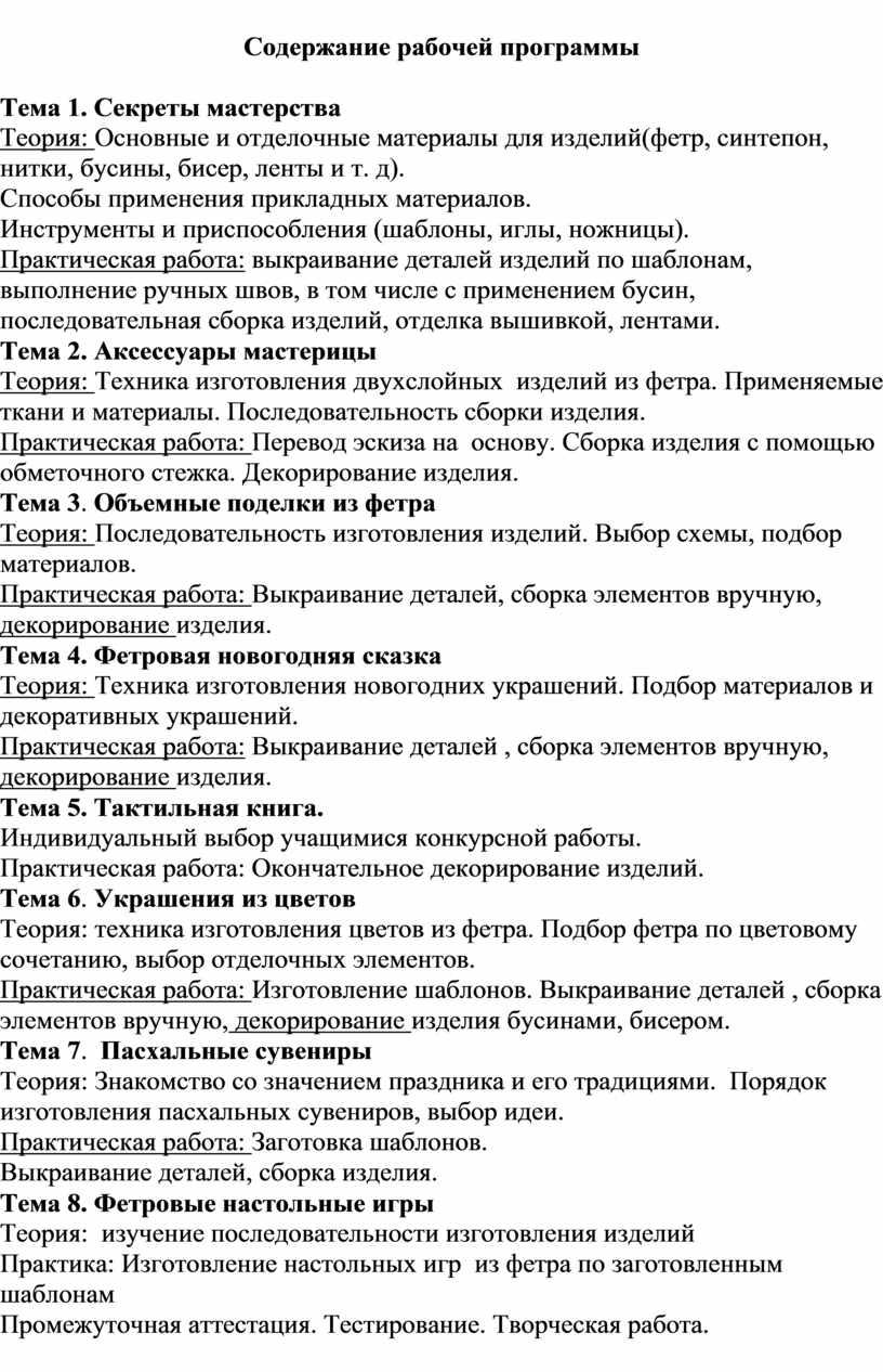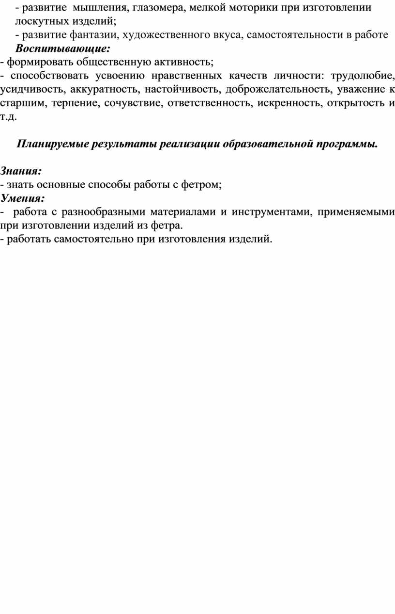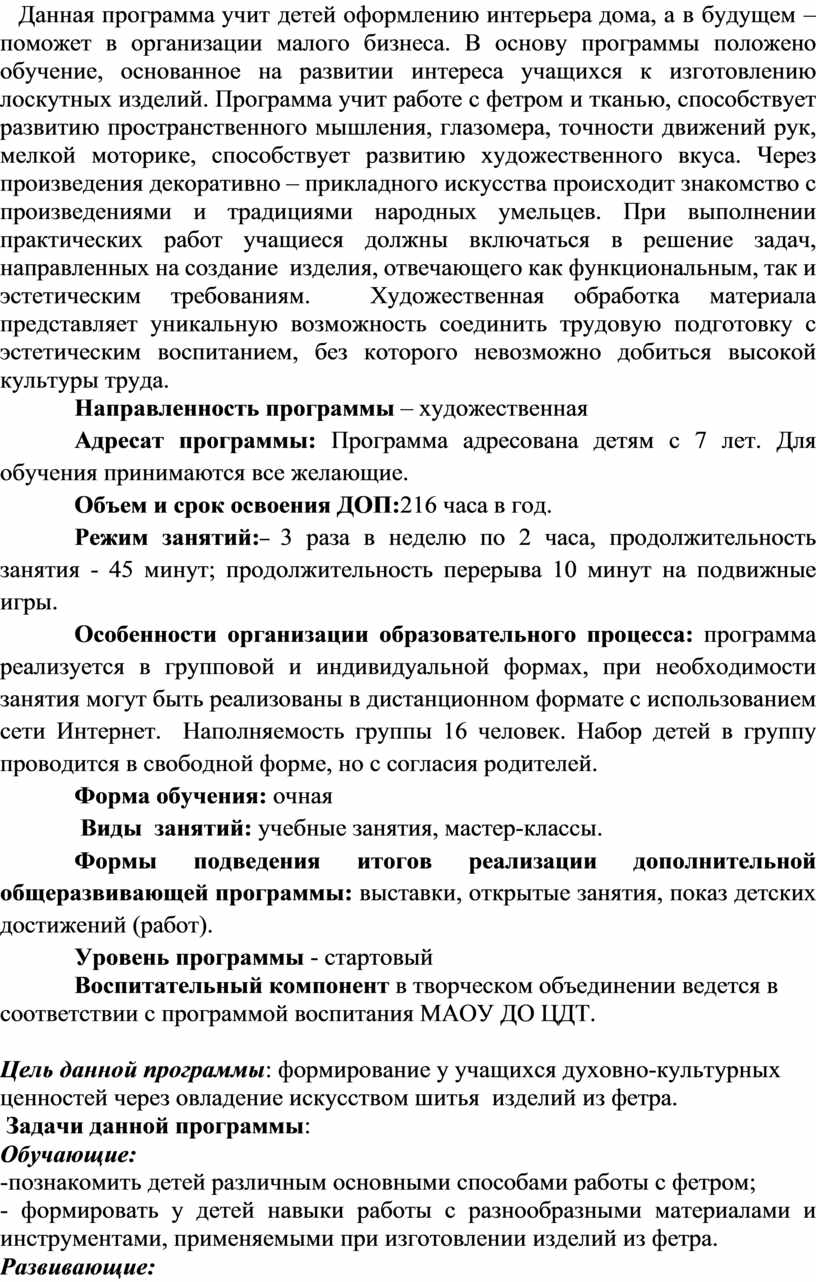 Цель данной программы: формирование у учащихся духовно-культурных ценностей через овладение искусством шитья изделий из фетра.