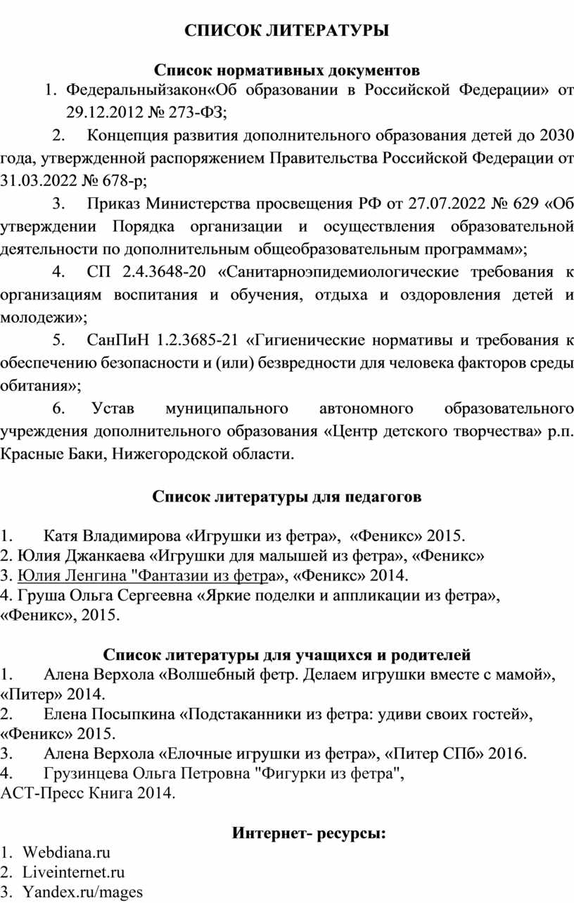 3. Приказ Министерства просвещения РФ от 27.07.2022 № 629 «Об утверждении Порядка организации и осуществления образовательной деятельности по дополнительным общеобразовательным программам»;