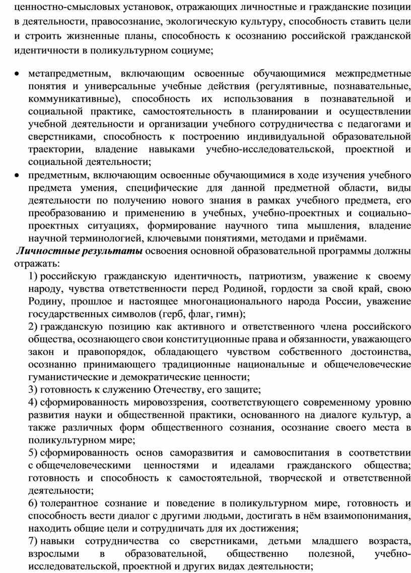 Стандарт устанавливает требования к результатам освоения обучающимися основной образовательной программы: личностным, включающим готовность и способность обучающихся к саморазвитию и личностному самоопределению, сформированность их мотивации к обучению и целенаправленной познавательной деятельности, системы значимых социальных и межличностных отношений, ценностно-смысловых установок, отражающих личностные и гражданские позиции в деятельности, правосознание, экологическую культуру, способность ставить цели и строить жизненные планы, способность к осознанию российской гражданской идентичности в поликультурном социуме;