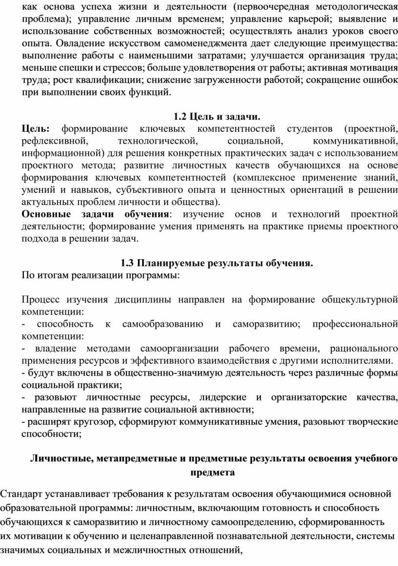 Личностные качества формируются на протяжении всей жизни. Каждый человек – носитель индивидуальных, только ему свойственных черт. Но требования разных профессий из всего многообразия проявлений характеров людей выделяют те, которые определяют успех той или иной конкретной профессиональной деятельности. В современном мире успех зависит не только от того, насколько эффективно личность управляет другими; едва ли не более важную роль играет умение человека управлять самим собой и рационально организовывать свою работу. Цель дисциплины - формирование знаний и умений эффективного применения базовых ресурсов личности (таких, как время, активность, платежеспособность, образованность); управление процессами жизнедеятельности личности (трудом, свободным временем, карьерой); управление результатами деятельности (уровнем квалификации, личными качествами, имиджем). Задачи дисциплины: преобразование личности менеджера как основа успеха жизни и деятельности (первоочередная методологическая проблема); управление личным временем; управление карьерой; выявление и использование собственных возможностей; осуществлять анализ уроков своего опыта. Овладение искусством самоменеджмента дает следующие преимущества: выполнение работы с наименьшими затратами; улучшается организация труда; меньше спешки и стрессов; больше удовлетворения от работы; активная мотивация труда; рост квалификации; снижение загруженности работой; сокращение ошибок при выполнении своих функций.