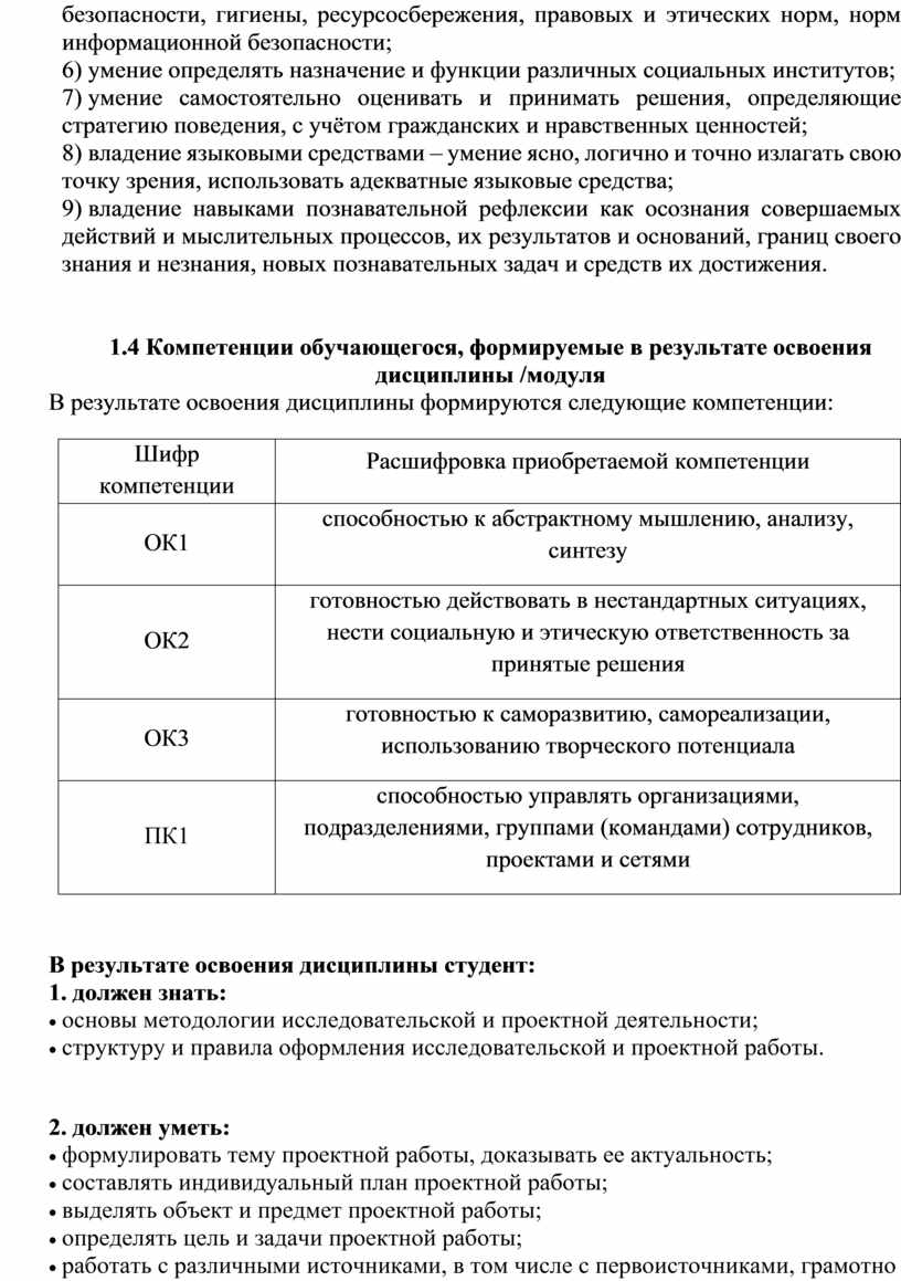 1.4. Компетенции обучающегося, формируемые в результате освоения