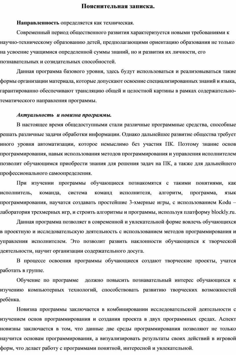 Данная программа позволяет в современной и увлекательной форме вовлечь обучающихся в проектную и исследовательскую деятельность с использованием методов программирования и управления исполнителем. Это позволит развить наклонности обучающихся к творческой деятельности, научит организации содержательного досуга.