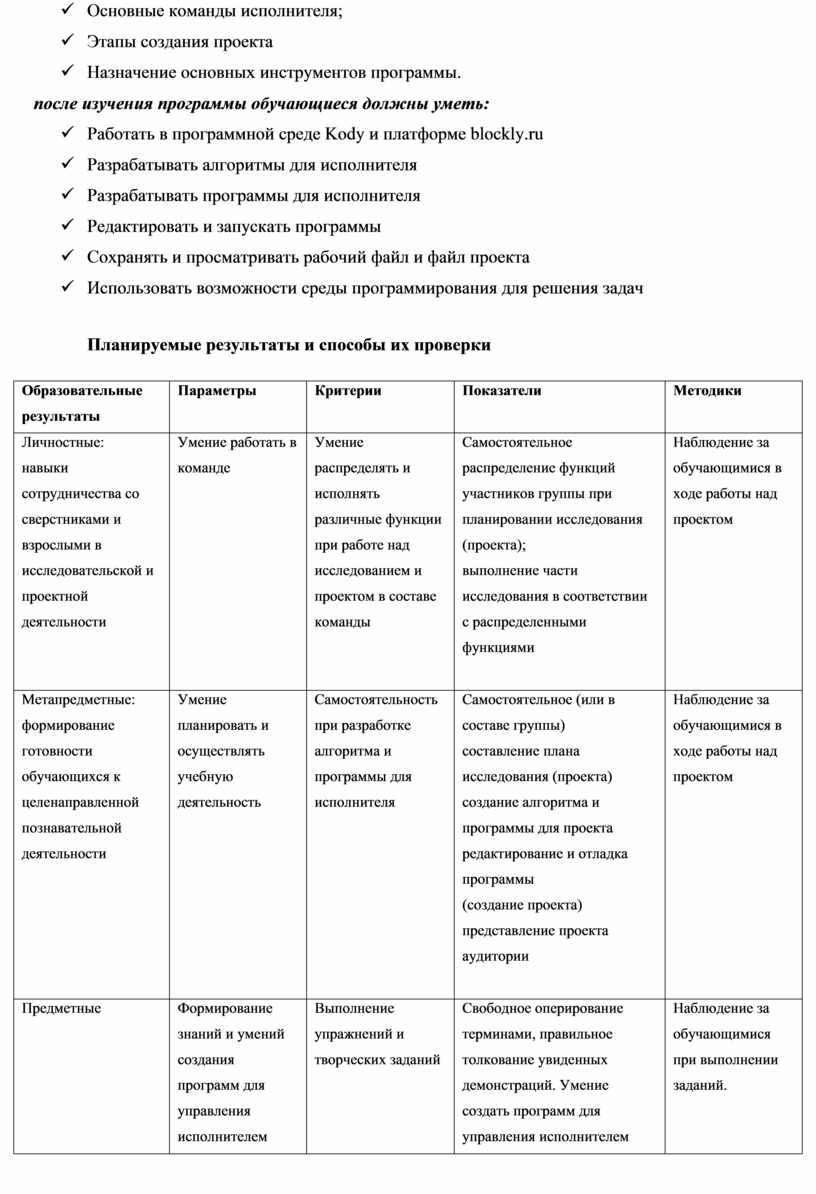 Итогом работы является собственный проект (исследование), оформленный в виде готового проекта (мини-игра, анимационный ролик, обучающая программа и т.п.), созданного на основе программной среды Kody и платформы blockly.ru.