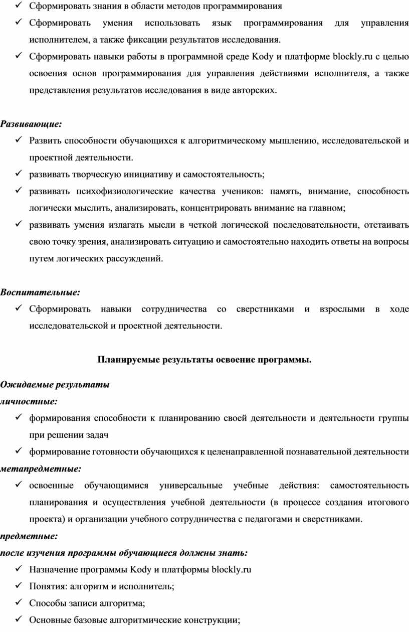 Цель программы: развитие личности ребенка, способного к исследовательской деятельности, через овладение основами программирования, планирования и проведения исследования, создания на их основе авторского проекта в используемых средах программирования.