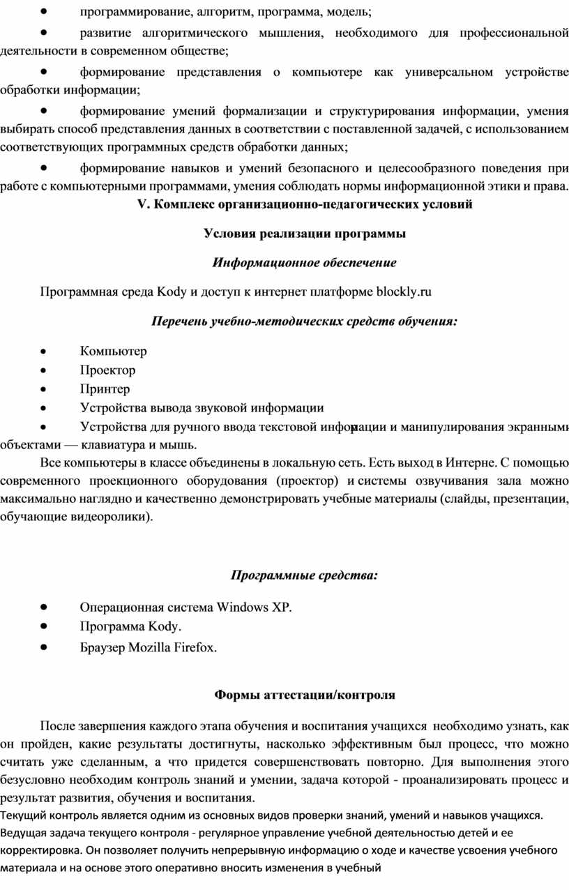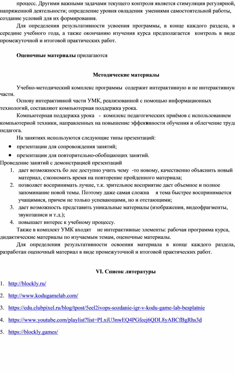 При прохождении программы обучающиеся изучают возможности программной среды Kodu и платформы blockly.ru для цифрового творчества в современном социуме. Знакомясь с ними, осваивают основные методы программирования действий исполнителя. Изучают возможности для творческой самореализации (анимационные, музыкальные, обучающие, игровые проекты).