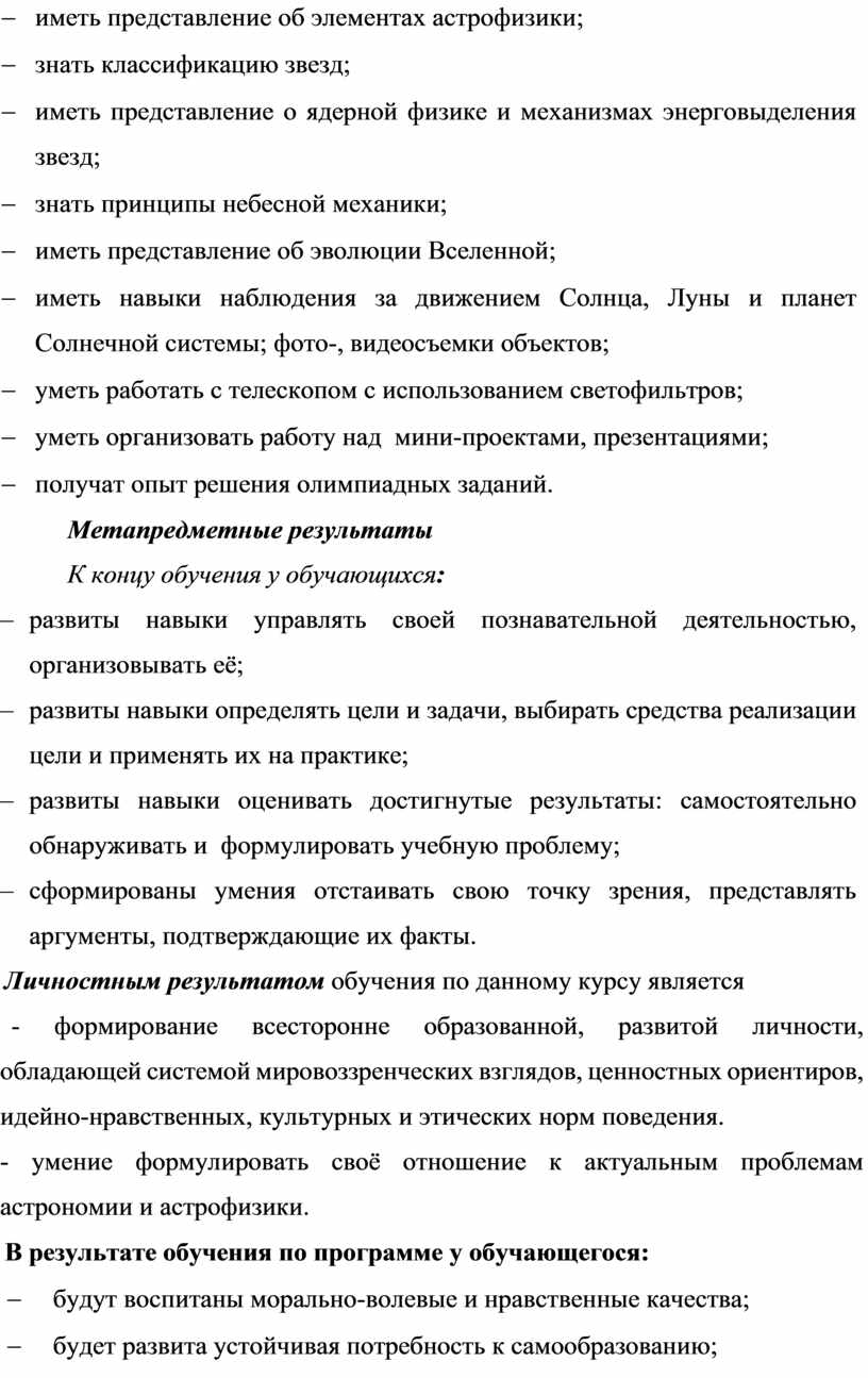 Цель-формирование научного мировоззрения учащихся посредством освоения основных разделов астрофизики.