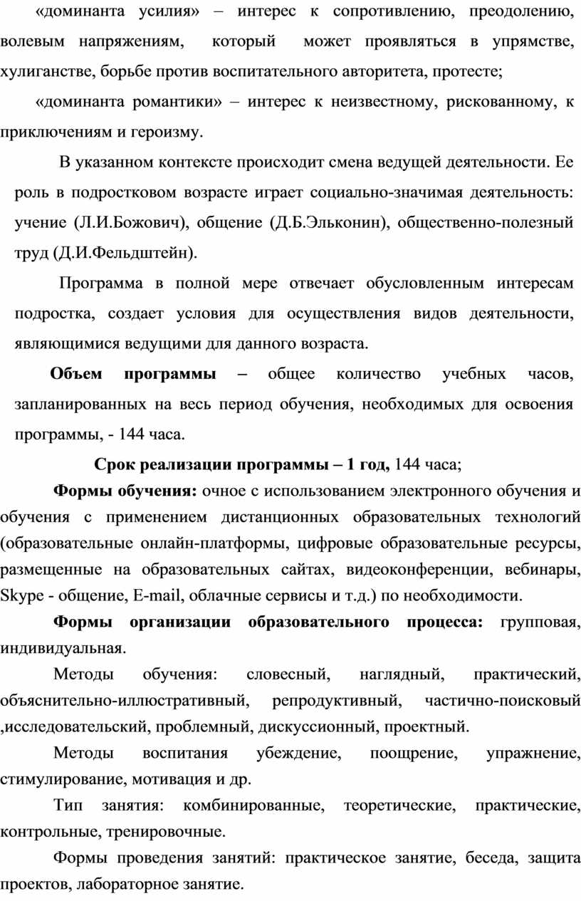 Программа в полной мере отвечает обусловленным интересам подростка, создает условия для осуществления видов деятельности, являющимися ведущими для данного возраста.
