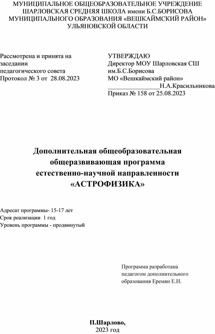 УТВЕРЖДАЮ Директор МОУ Шарловская СШ им.Б.С.Борисова МО «Вешкаймский район» ________________Н.А.Красильникова Приказ № 158 от 25.08.2023 |