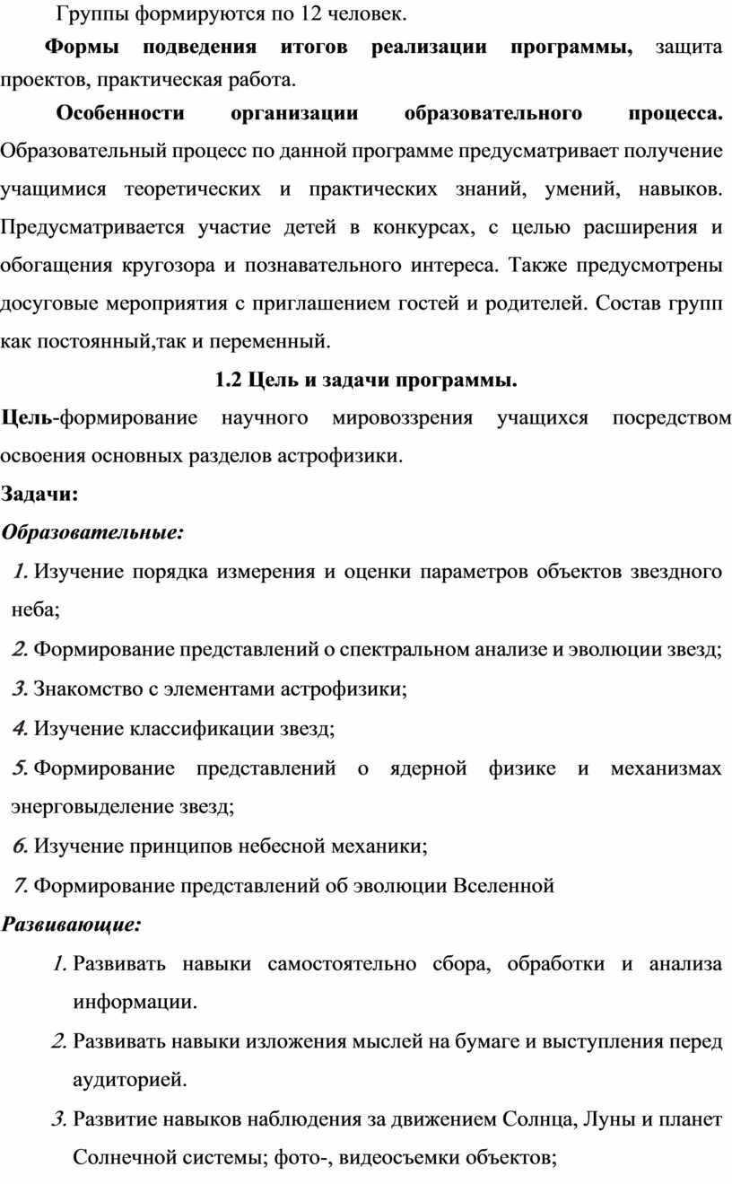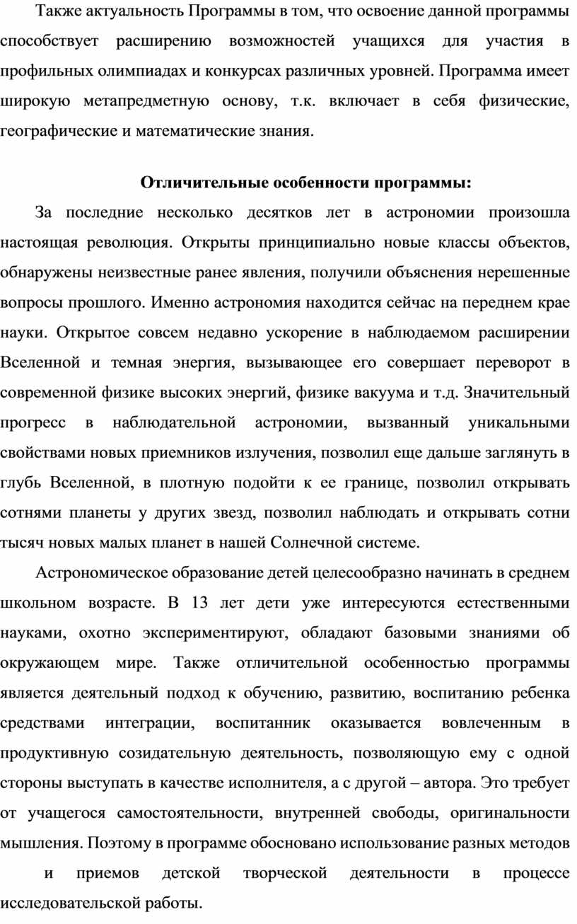 Астрономическое образование детей целесообразно начинать в среднем школьном возрасте. В 13 лет дети уже интересуются естественными науками, охотно экспериментируют, обладают базовыми знаниями об окружающем мире. Также отличительной особенностью программы является деятельный подход к обучению, развитию, воспитанию ребенка средствами интеграции, воспитанник оказывается вовлеченным в продуктивную созидательную деятельность, позволяющую ему с одной стороны выступать в качестве исполнителя, а с другой – автора. Это требует от учащегося самостоятельности, внутренней свободы, оригинальности мышления. Поэтому в программе обосновано использование разных методов и приемов детской творческой деятельности в процессе исследовательской работы.
