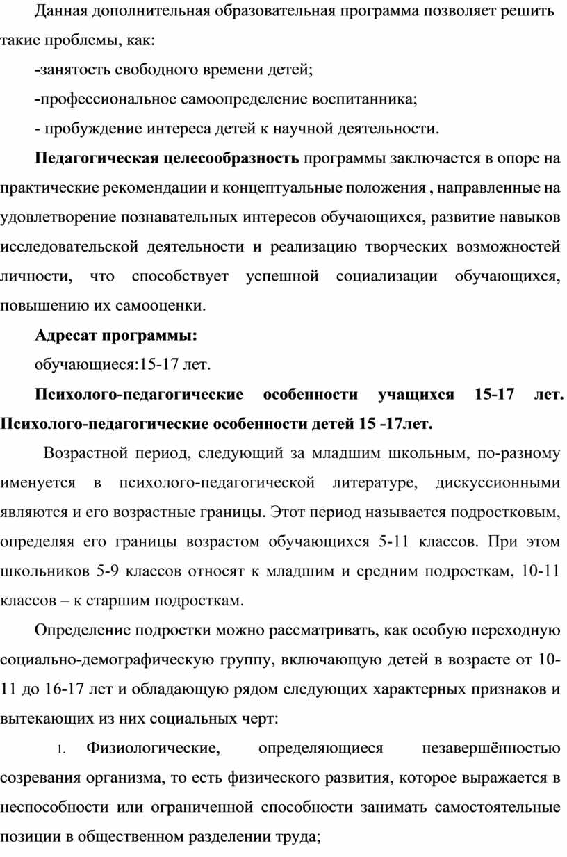 Педагогическая целесообразность программы заключается в опоре на практические рекомендации и концептуальные положения , направленные на удовлетворение познавательных интересов обучающихся, развитие навыков исследовательской деятельности и реализацию творческих возможностей личности, что способствует успешной социализации обучающихся, повышению их самооценки.