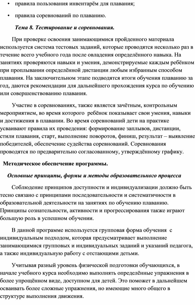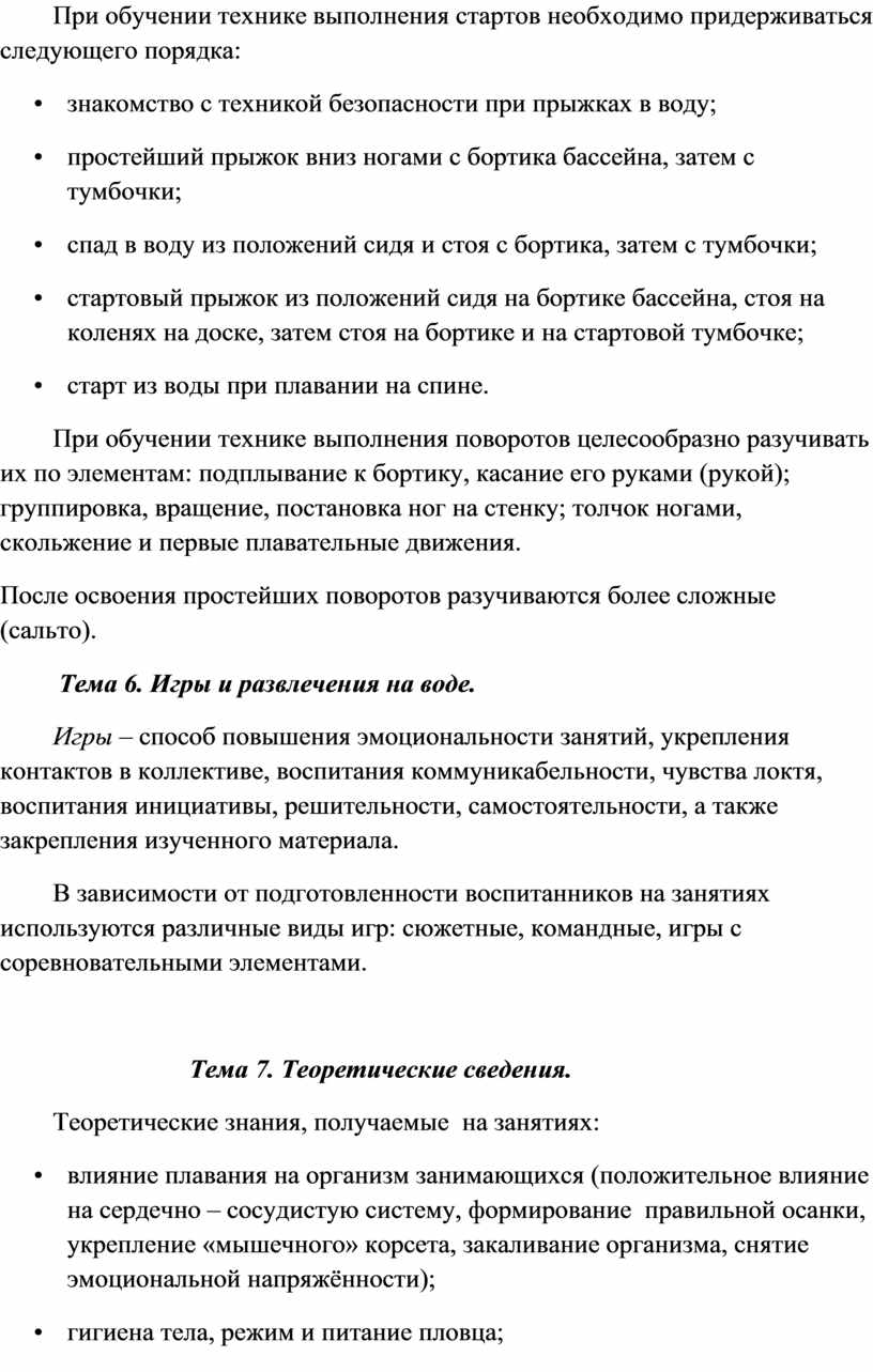 Теоретические сведения (влияние плавания на организм занимающихся; режим и питание пловца; оборудование и инвентарь для плавания; правила соревнований по плаванию) |