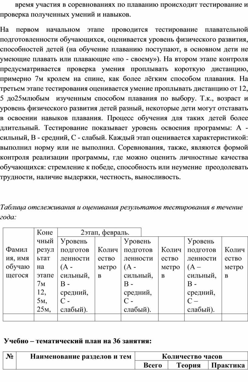 На первом начальном этапе проводится тестирование плавательной подготовленности обучающихся, оценивается уровень физического развития, способностей детей (на обучение плаванию поступают, в основном дети не умеющие плавать или плавающие «по - своему»). На втором этапе контроля предусматривается проверка умения проплывать короткую дистанцию, примерно 7м кролем на спине, как более лёгким способом плавания. На третьем этапе тестирования оценивается умение проплывать дистанцию от 12, 5 до25млюбым изученным способом плавания по выбору. Т.к., возраст и уровень физического развития детей разный, некоторые дети могут отставать в освоении навыков плавания. Процесс обучения для таких детей более длительный. Тестирование показывает уровень освоения программы: А - сильный, В - средний, С - слабый. Каждый этап оценивается характеристикой: выполнил норму или не выполнил. Соревнования, также, являются формой контроля реализации программы, где можно оценить личностные качества обучающихся: стремление к победе, способность или неумение преодолевать трудности, наличие выдержки, честность, выносливость.