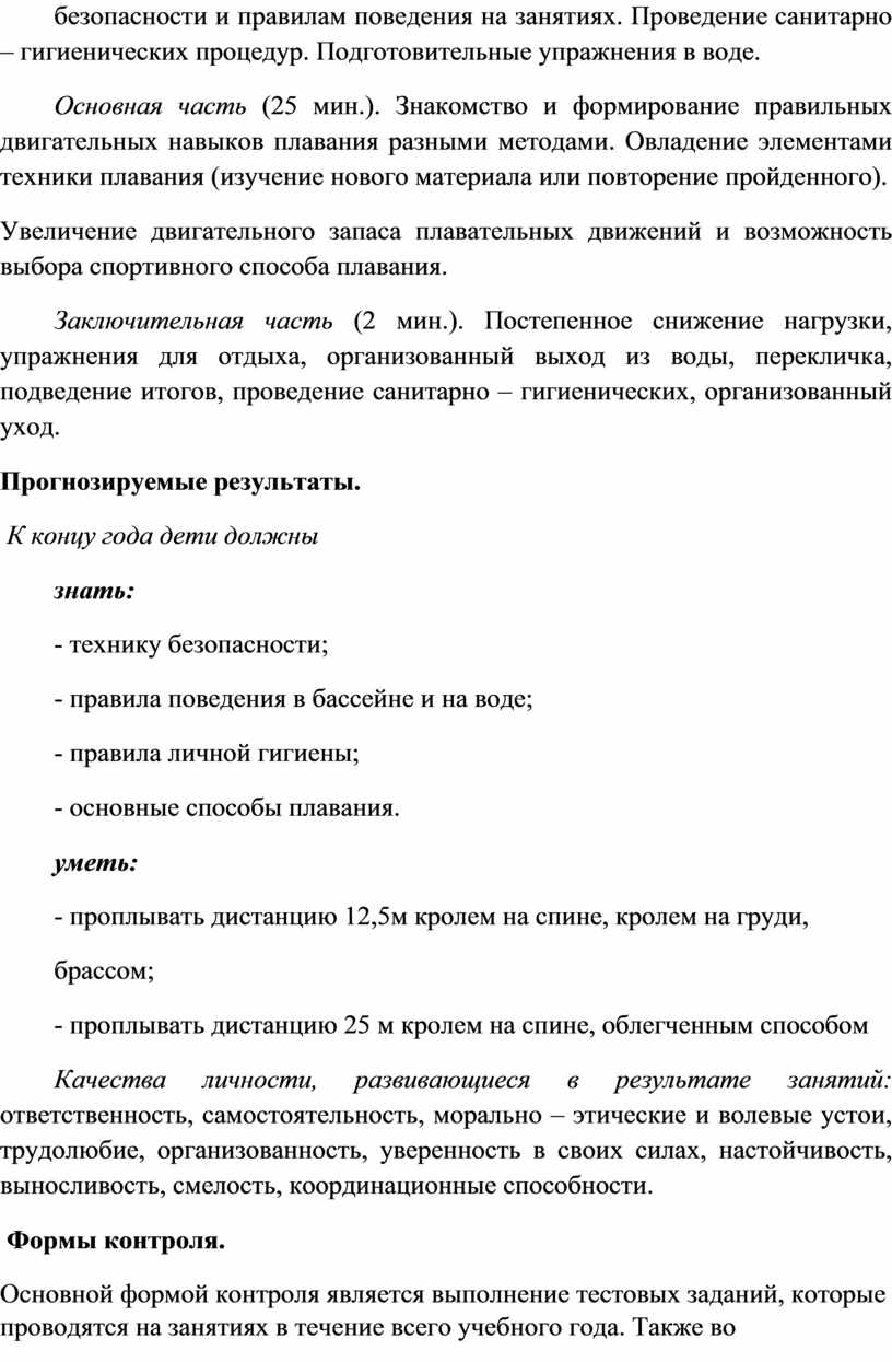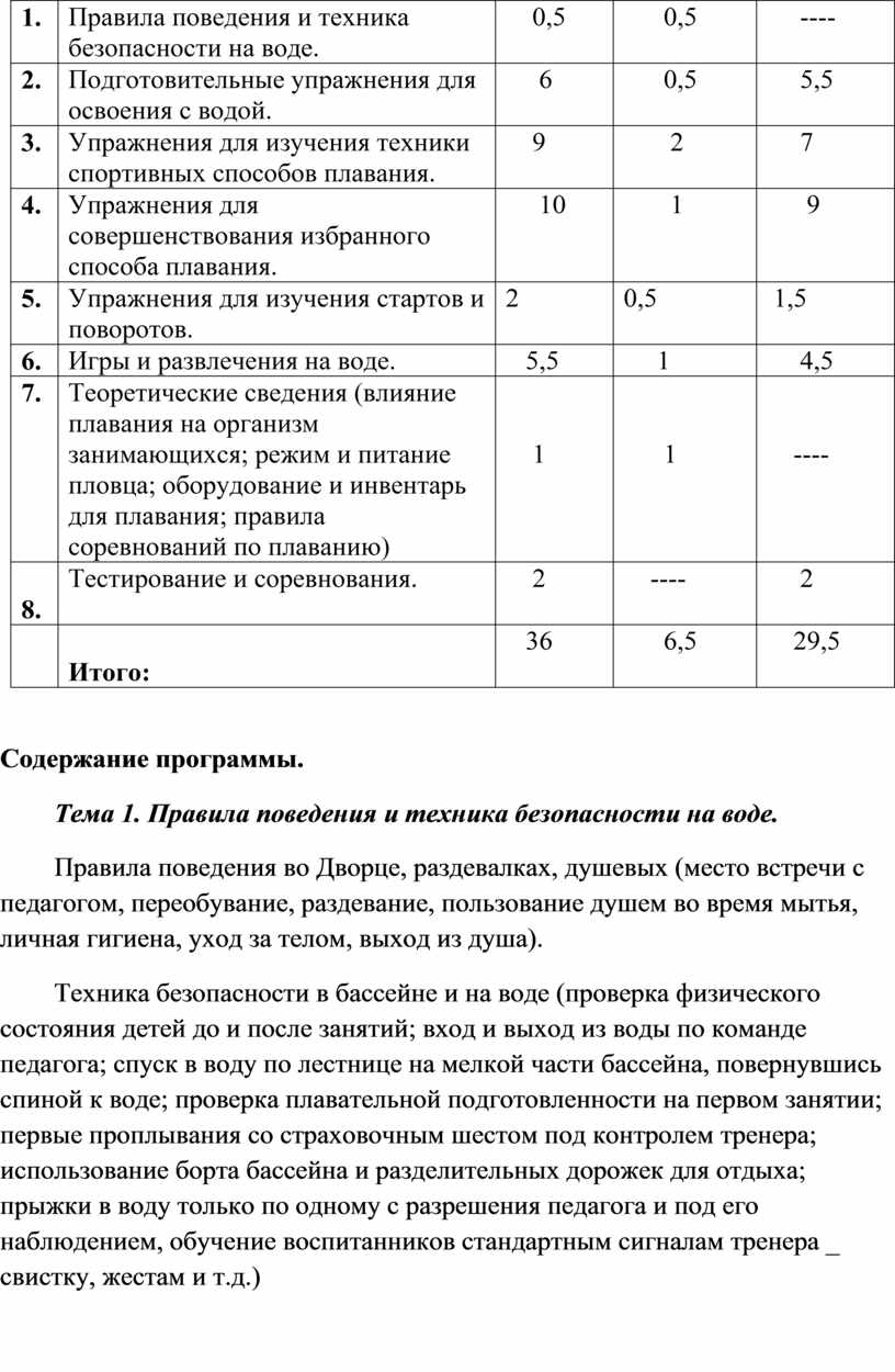 Техника безопасности в бассейне и на воде (проверка физического состояния детей до и после занятий; вход и выход из воды по команде педагога; спуск в воду по лестнице на мелкой части бассейна, повернувшись спиной к воде; проверка плавательной подготовленности на первом занятии; первые проплывания со страховочным шестом под контролем тренера; использование борта бассейна и разделительных дорожек для отдыха; прыжки в воду только по одному с разрешения педагога и под его наблюдением, обучение воспитанников стандартным сигналам тренера _ свистку, жестам и т.д.)