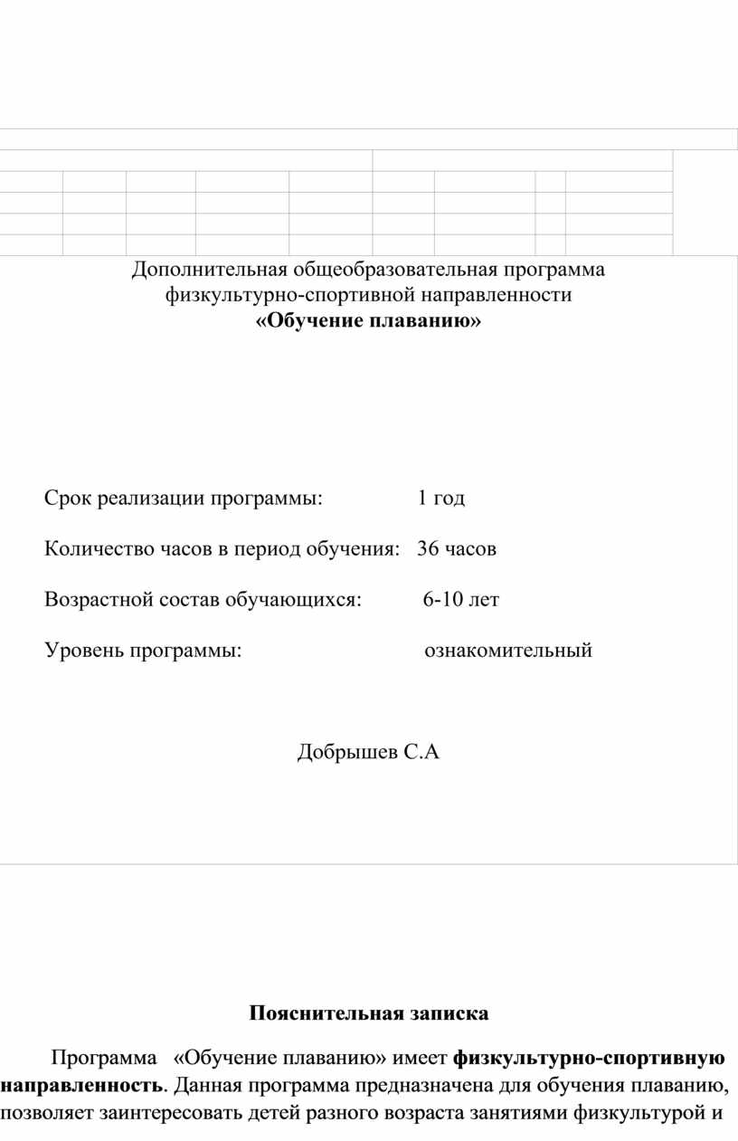 Дополнительная общеобразовательная программа физкультурно-спортивной направленности «Обучение плаванию»