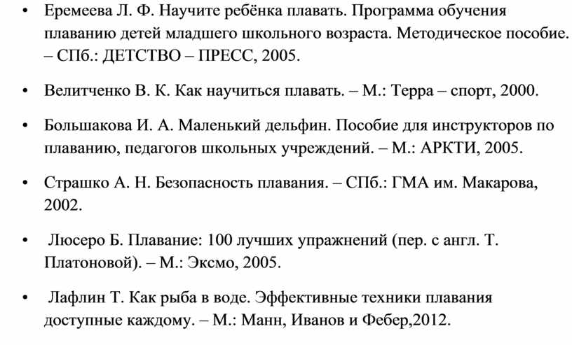 • Еремеева Л. Ф. Научите ребёнка плавать. Программа обучения плаванию детей младшего школьного возраста. Методическое пособие. – СПб.: ДЕТСТВО – ПРЕСС, 2005.