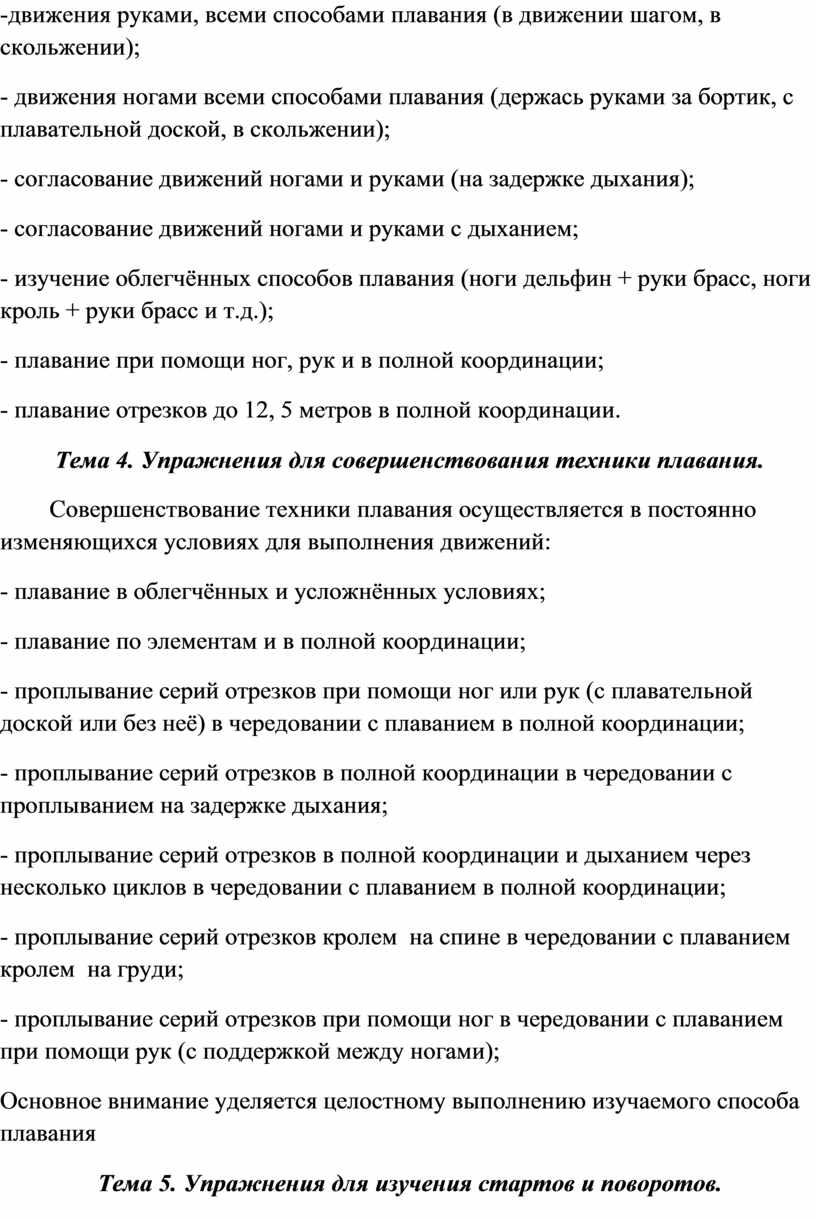 - движения ногами всеми способами плавания (держась руками за бортик, с плавательной доской, в скольжении);