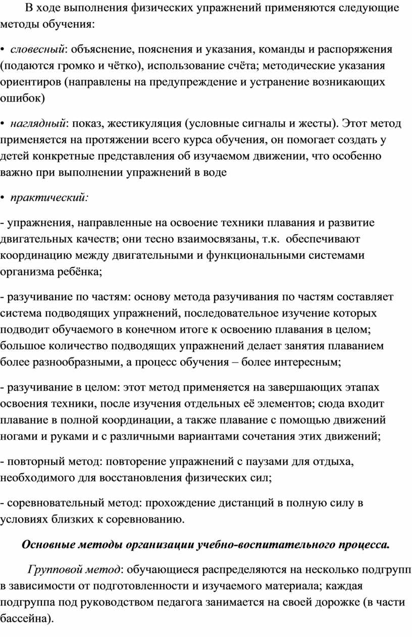 Групповой метод: обучающиеся распределяются на несколько подгрупп в зависимости от подготовленности и изучаемого материала; каждая подгруппа под руководством педагога занимается на своей дорожке (в части бассейна).