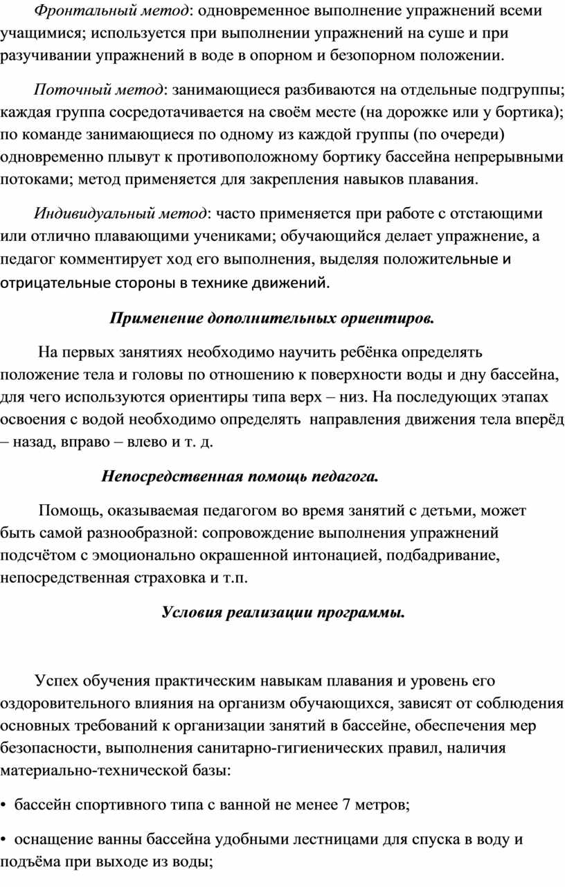 Фронтальный метод: одновременное выполнение упражнений всеми учащимися; используется при выполнении упражнений на суше и при разучивании упражнений в воде в опорном и безопорном положении.
