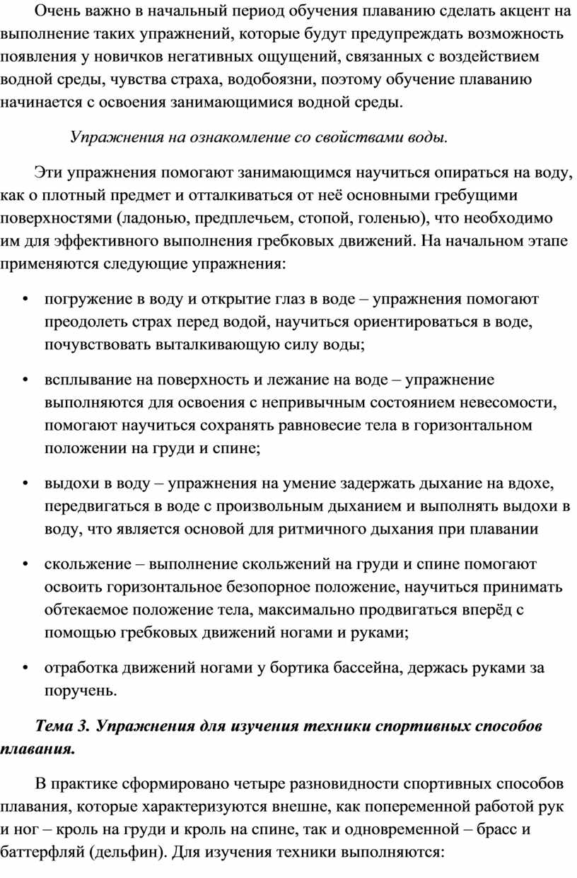 Тема 3. Упражнения для изучения техники спортивных способов плавания.