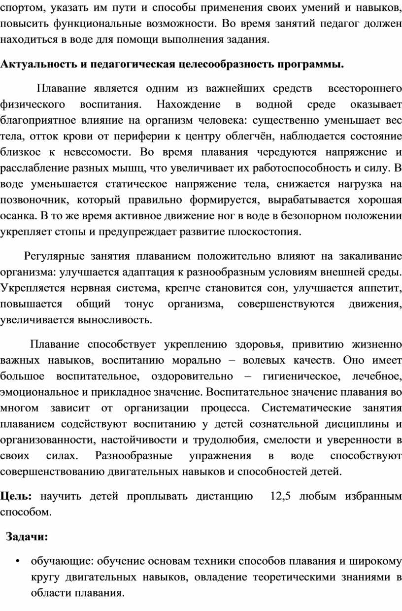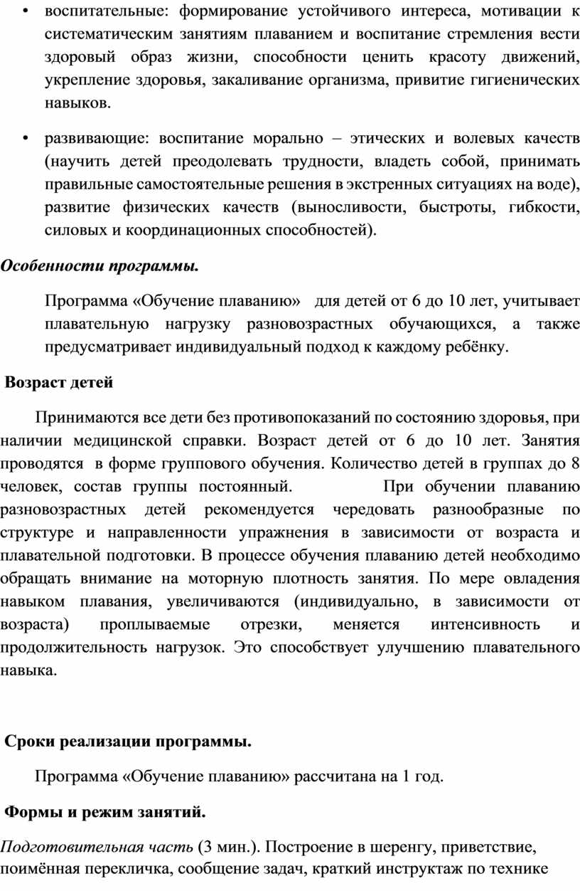 Программа «Обучение плаванию» имеет физкультурно-спортивную направленность. Данная программа предназначена для обучения плаванию, позволяет заинтересовать детей разного возраста занятиями физкультурой и спортом, указать им пути и способы применения своих умений и навыков, повысить функциональные возможности. Во время занятий педагог должен находиться в воде для помощи выполнения задания.