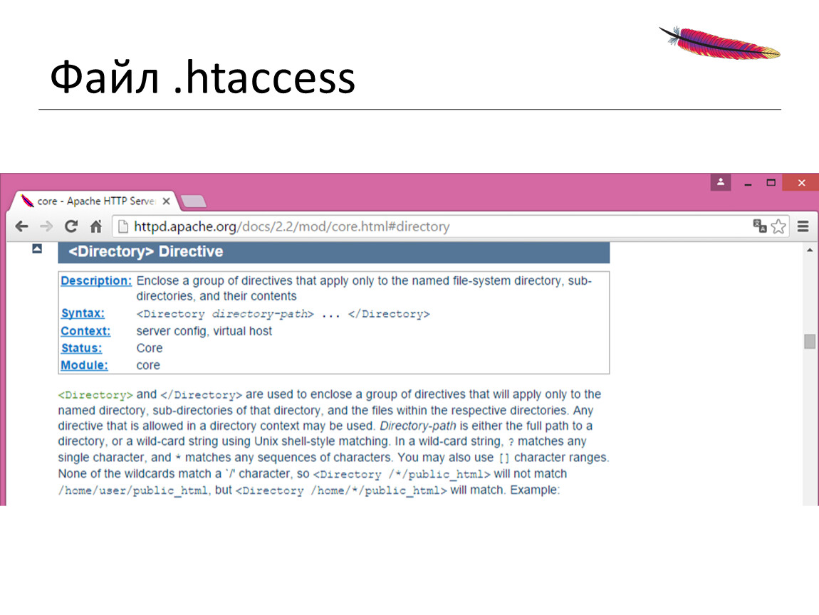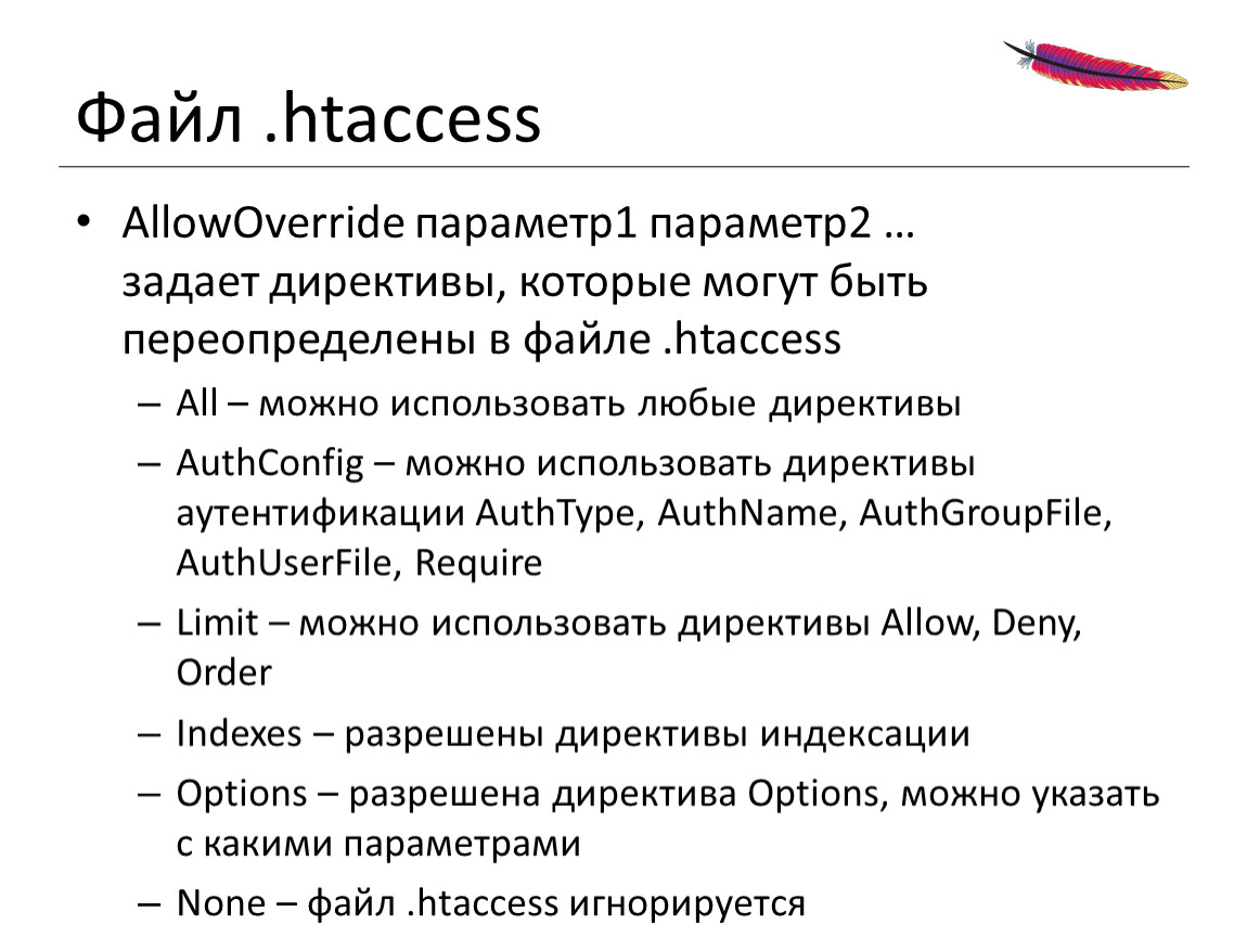 AuthConfig – можно использовать директивы аутентификации AuthType, AuthName, AuthGroupFile, AuthUserFile, Require