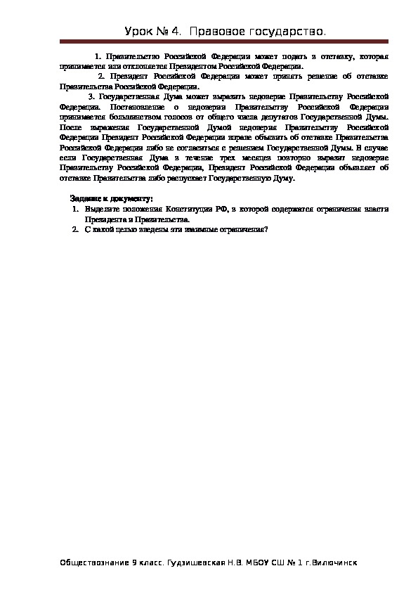 Дополнительные материалы к уроку "Правовое государство" содержат фрагменты Конституции Российской Федерации (1993г) о полномочиях Президента РФ, Правительства РФ и Государственной Думы. Анализ этих статей важен для понимания современной трактовки принципа разделения властей как системы сдержек и противовесов. После устного обсуждения вопросов к документу обучающиеся с опорой на текст учебника составляют схему "Высшие государственные органы власти РФ".Дополнительные материалы к уроку "Правовое государство" 9 класс обществознание по учебнику Боголюбова Л.Н.