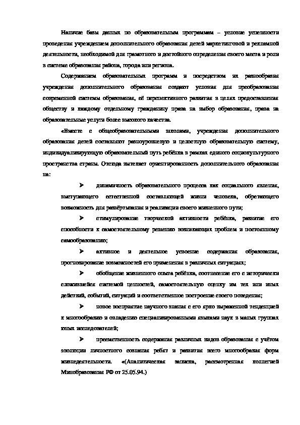 Минобразования РФ от 25.05.94.)В заключение следует сказать, что программам дополнительного образования