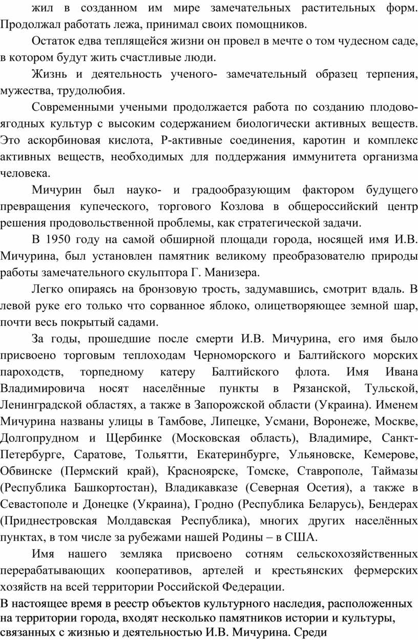 О Мичурине написано немало, однако огромный пласт его наследия остается нетронутой почвой для дальнейших изысканий не только ученых, но и поэтов, деятелей искусства.