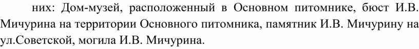 В настоящее время в реестр объектов культурного наследия, расположенных на территории города, входят несколько памятников истории и культуры, связанных с жизнью и деятельностью И.В. Мичурина. Среди них: Дом-музей, расположенный в Основном питомнике, бюст И.В. Мичурина на территории Основного питомника, памятник И.В. Мичурину на ул.Советской, могила И.В. Мичурина.