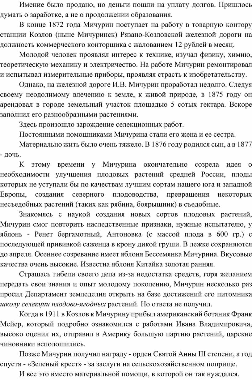 ДОРОГА ЖИЗНИ И.В.МИЧУРИНА