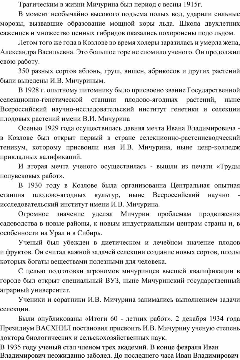 Трагическим в жизни Мичурина был период с весны 1915г.
