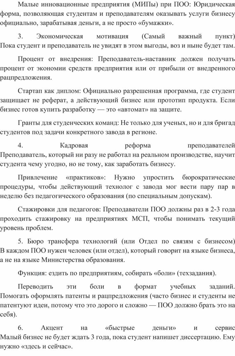 Малые инновационные предприятия (МИПы) при ПОО: Юридическая форма, позволяющая студентам и преподавателям оказывать услуги бизнесу официально, зарабатывая деньги, а не просто «бумажки».