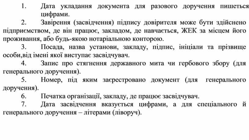 7. Термін дії разового доручення вказується цифрами, а спеціального й генерального – літерами.