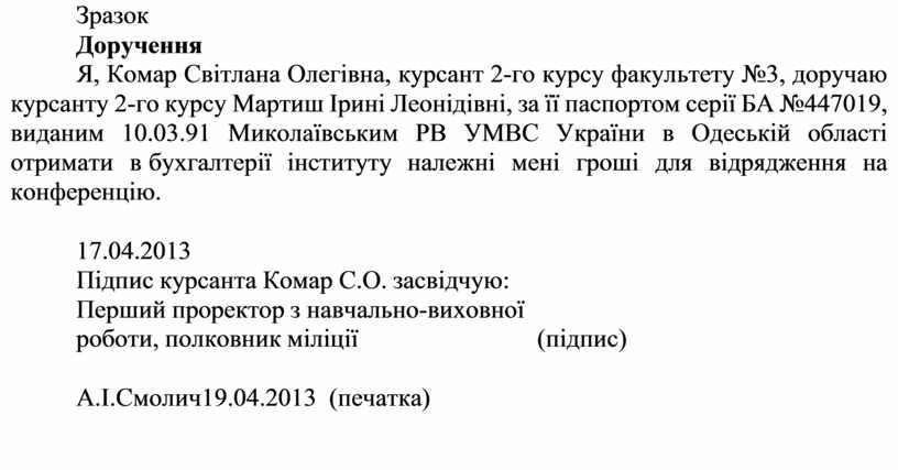 Я, Комар Світлана Олегівна, курсант 2-го курсу факультету №3, доручаю курсанту 2-го курсу Мартиш Ірині Леонідівні, за її паспортом серії БА №447019, виданим 10.03.91 Миколаївським РВ УМВС України в Одеській області отримати в бухгалтерії інституту належні мені гроші для відрядження на конференцію.