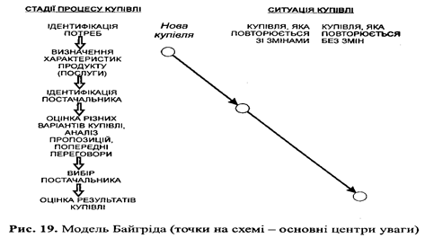 Існує кілька моделей поведінки споживачів у промисловому маркетингу. Так, модель Байгріда поділяє процес купівлі на шість послідовних кроків, виділяючи основні центри уваги залежно від ситуації купівлі (рис. 19).