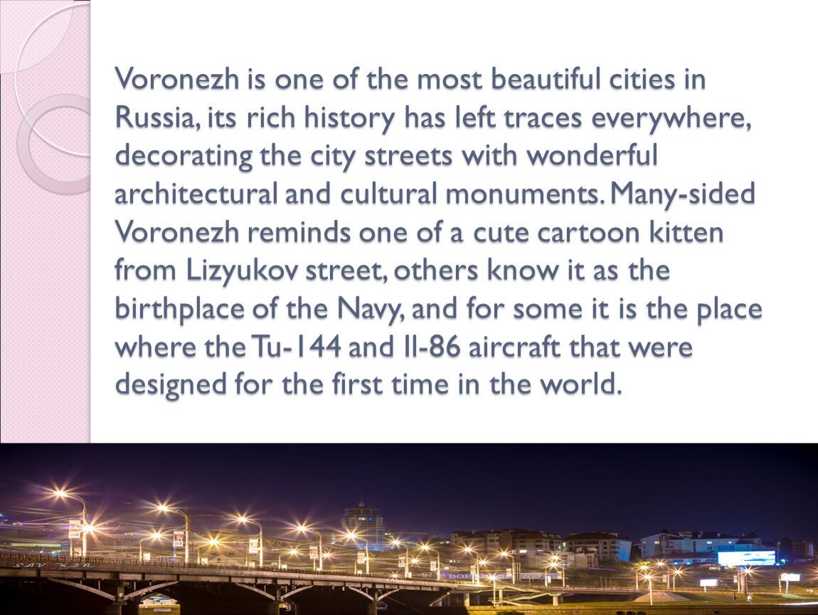Voronezh is one of the most beautiful cities in Russia, its rich history has left traces everywhere, decorating the city streets with wonderful architectural and cultural monuments. Many-sided Voronezh reminds one of a cute cartoon kitten from Lizyukov street, others know it as the birthplace of the Navy, and for some it is the place where the Tu-144 and Il-86 aircraft that were designed for the first time in the world.