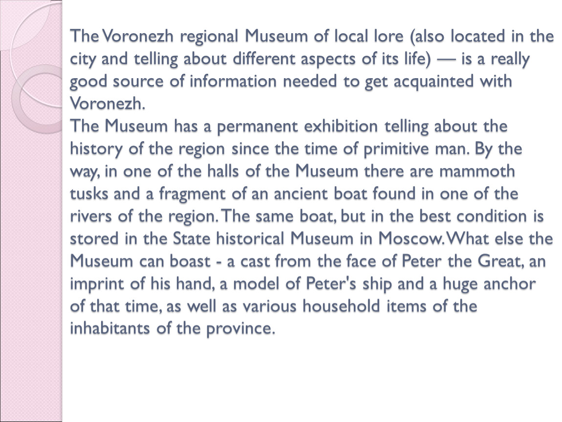 The Voronezh regional Museum of local lore (also located in the city and telling about different aspects of its life) — is a really good source of information needed to get acquainted with Voronezh.The Museum has a permanent exhibition telling about the history of the region since the time of primitive man. By the way, in one of the halls of the Museum there are mammoth tusks and a fragment of an ancient boat found in one of the rivers of the region. The same boat, but in the best condition is stored in the State historical Museum in Moscow. What else the Museum can boast - a cast from the face of Peter the Great, an imprint of his hand, a model of Peter's ship and a huge anchor of that time, as well as various household items of the inhabitants of the province.