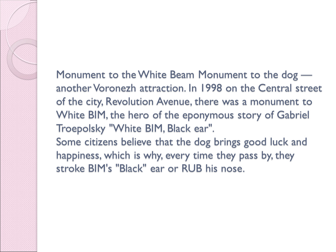 Monument to the White Beam Monument to the dog — another Voronezh attraction. In 1998 on the Central street of the city, Revolution Avenue, there was a monument to White BIM, the hero of the eponymous story of Gabriel Troepolsky "White BIM, Black ear".Some citizens believe that the dog brings good luck and happiness, which is why, every time they pass by, they stroke BIM's "Black" ear or RUB his nose.