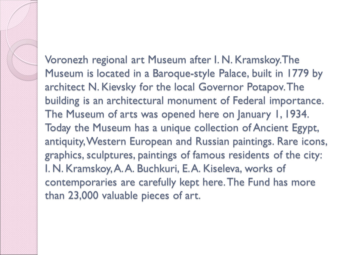Voronezh regional art Museum after I. N. Kramskoy.The Museum is located in a Baroque-style Palace, built in 1779 by architect N. Kievsky for the local Governor Potapov. The building is an architectural monument of Federal importance. The Museum of arts was opened here on January 1, 1934. Today the Museum has a unique collection of Ancient Egypt, antiquity, Western European and Russian paintings. Rare icons, graphics, sculptures, paintings of famous residents of the city: I. N. Kramskoy, A. A. Buchkuri, E. A. Kiseleva, works of contemporaries are carefully kept here. The Fund has more than 23,000 valuable pieces of art.