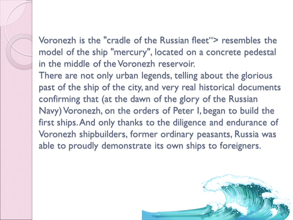 Voronezh is the "cradle of the Russian fleet“> resembles the model of the ship "mercury", located on a concrete pedestal in the middle of the Voronezh reservoir. There are not only urban legends, telling about the glorious past of the ship of the city, and very real historical documents confirming that (at the dawn of the glory of the Russian Navy) Voronezh, on the orders of Peter I, began to build the first ships. And only thanks to the diligence and endurance of Voronezh shipbuilders, former ordinary peasants, Russia was able to proudly demonstrate its own ships to foreigners.