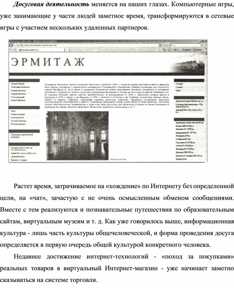 Растет время, затрачиваемое на «хождение» по Интернету без определенной цели, на «чат», зачастую с не очень осмысленным обменом сообщениями. Вместе с тем реализуются и познавательные путешествия по образовательным сайтам, виртуальным музеям и т. д. Как уже говорилось выше, информационная культура - лишь часть культуры общечеловеческой, и форма проведения досуга определяется в первую очередь общей культурой конкретного человека.