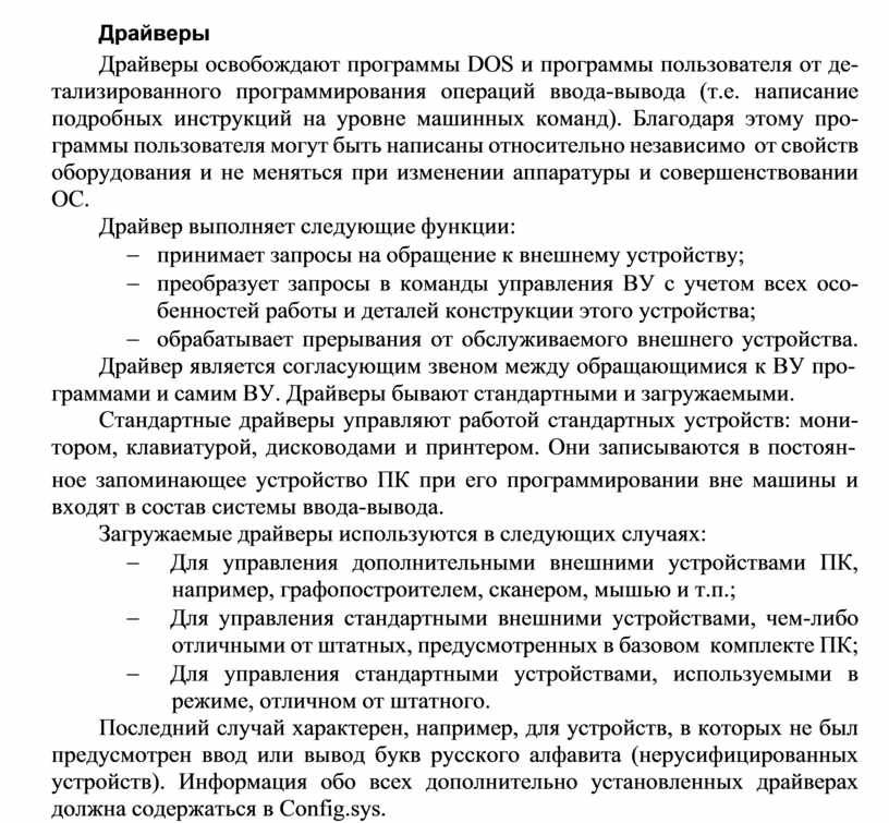 Драйверы освобождают программы DOS и программы пользователя от де- тализированного программирования операций ввода-вывода (т.е. написание подробных инструкций на уровне машинных команд). Благодаря этому про- граммы пользователя могут быть написаны относительно независимо от свойств оборудования и не меняться при изменении аппаратуры и совершенствовании ОС.