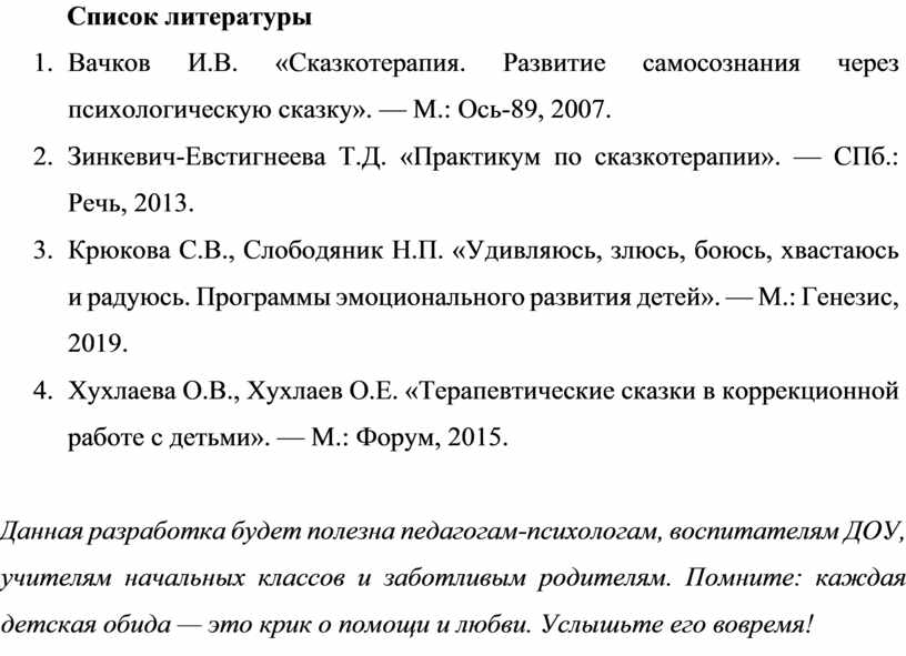 Данная разработка будет полезна педагогам-психологам, воспитателям ДОУ, учителям начальных классов и заботливым родителям. Помните: каждая детская обида — это крик о помощи и любви. Услышьте его вовремя!
