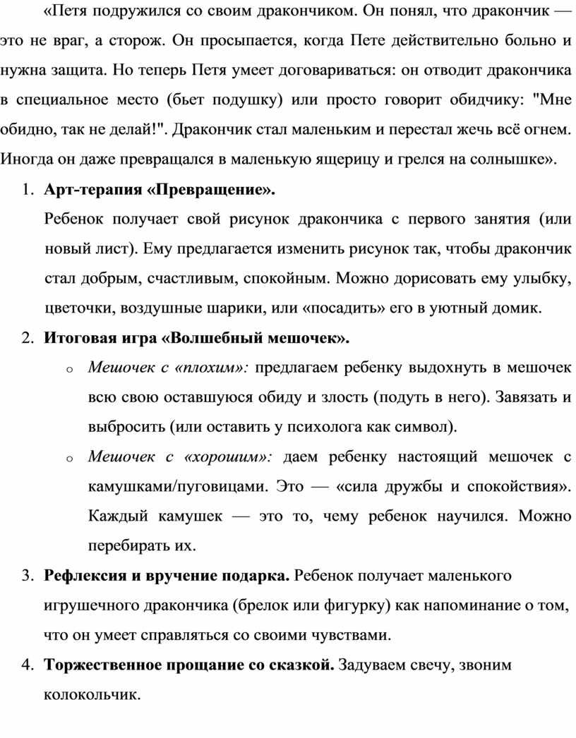 5. Рефлексия и вручение подарка. Ребенок получает маленького игрушечного дракончика (брелок или фигурку) как напоминание о том, что он умеет справляться со своими чувствами.