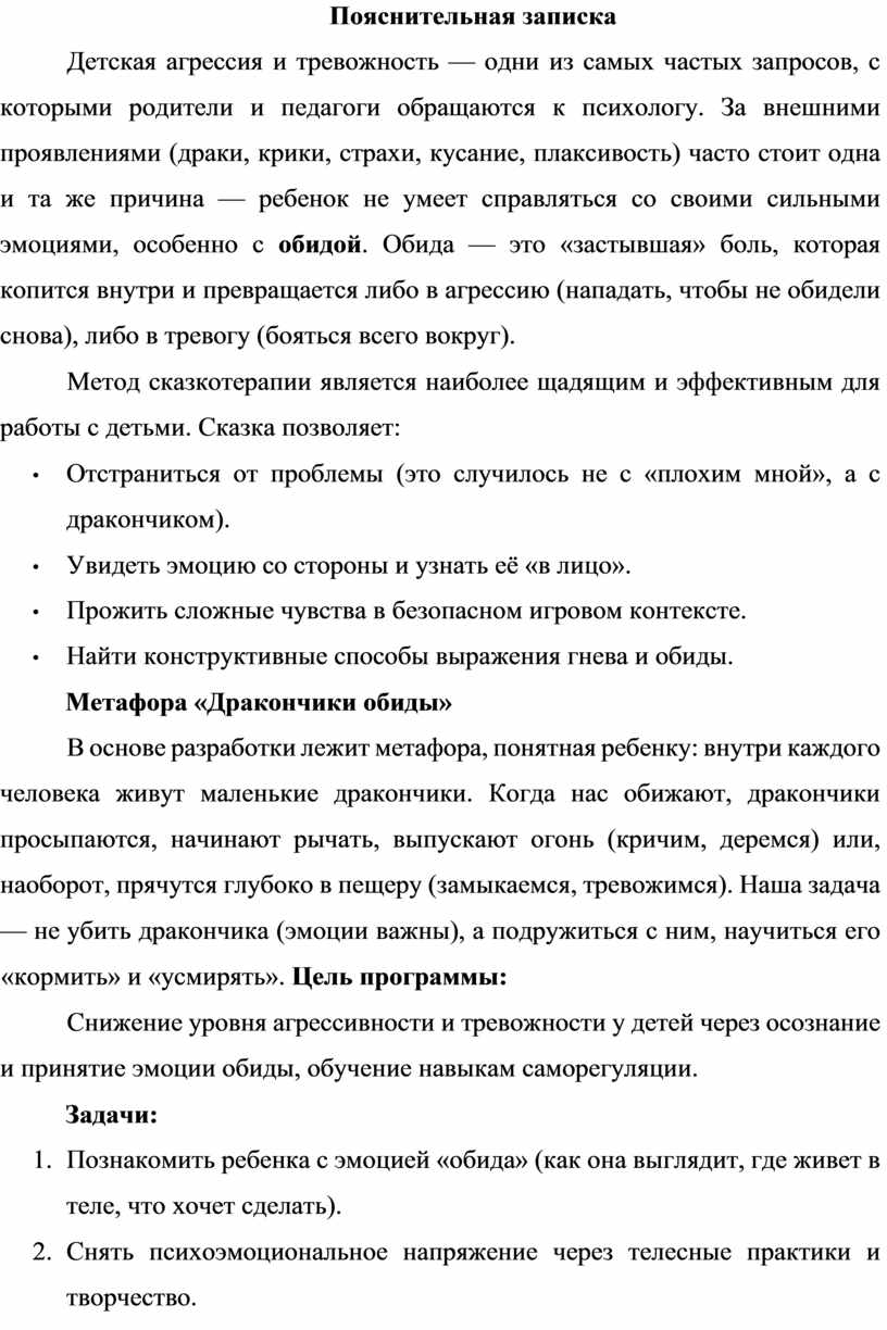 Снижение уровня агрессивности и тревожности у детей через осознание и принятие эмоции обиды, обучение навыкам саморегуляции.