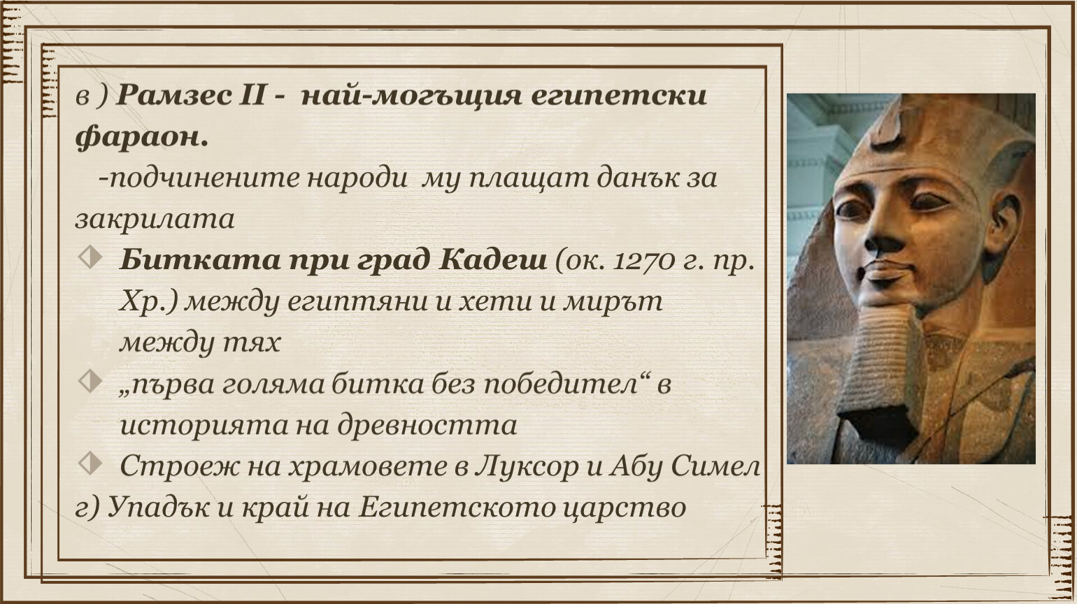 в ) Рамзес II - най-могъщия египетски фараон.