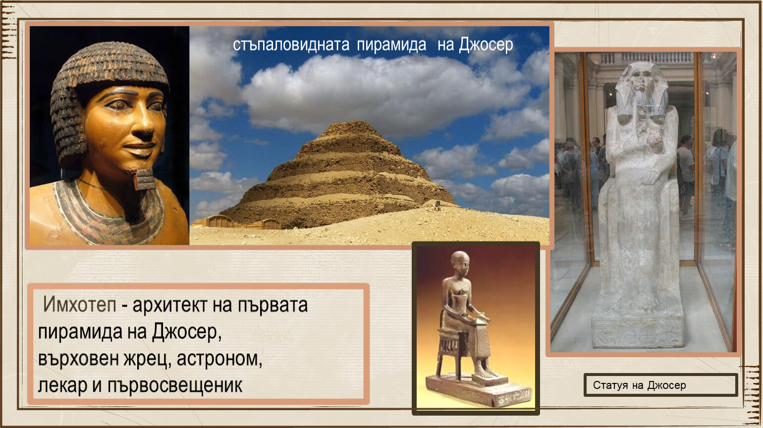 Имхотеп - архитект на първата пирамида на Джосер, върховен жрец, астроном, лекар и първосвещеник