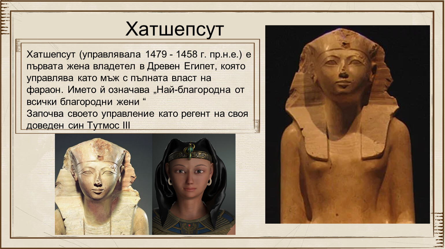 Хатшепсут (управлявала 1479 - 1458 г. пр.н.е.) е първата жена владетел в Древен Египет, която управлява като мъж с пълната власт на фараон. Името й означава „Най-благородна от всички благородни жени “