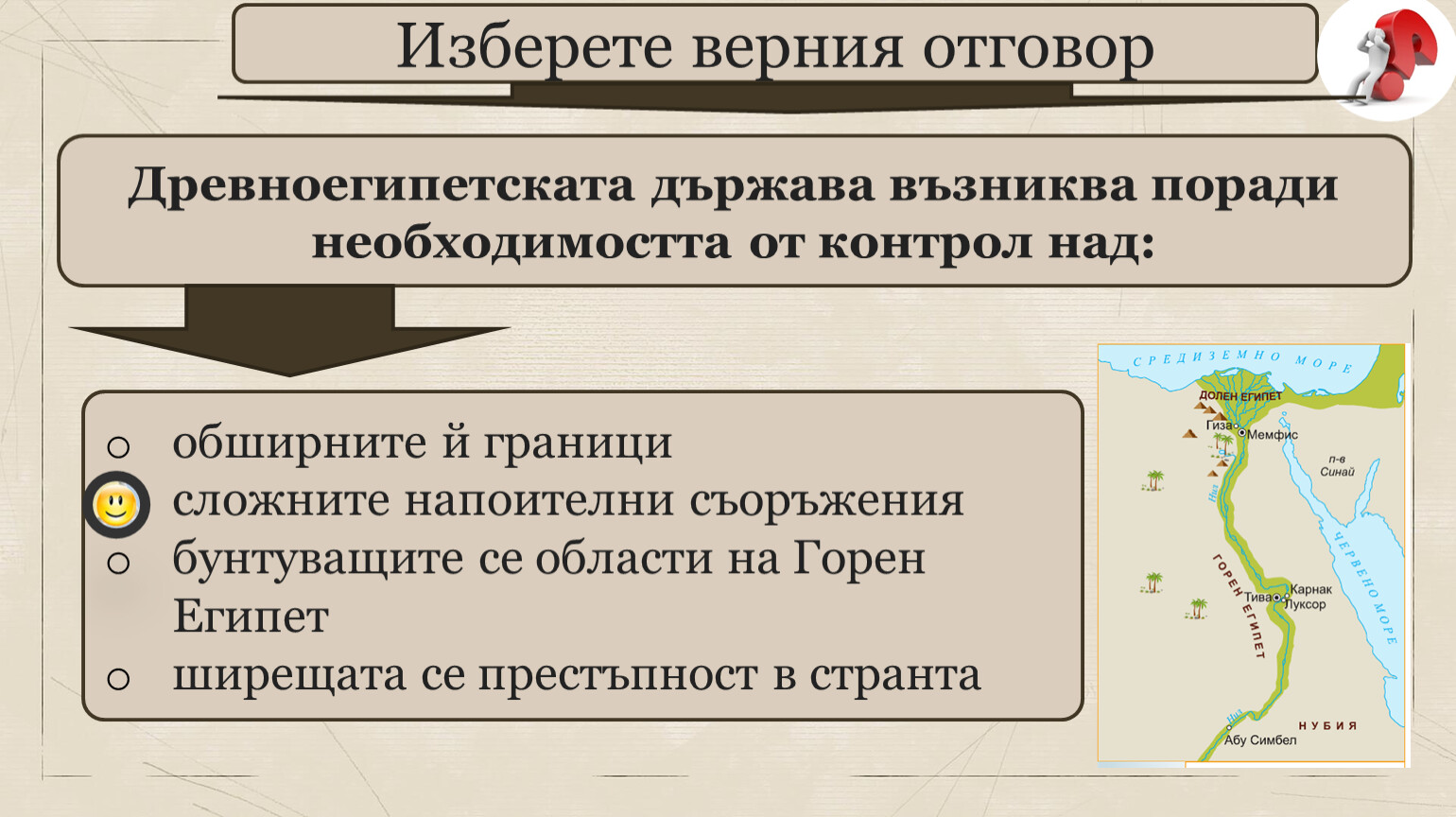 Древноегипетската държава възниква поради необходимостта от контрол над:
